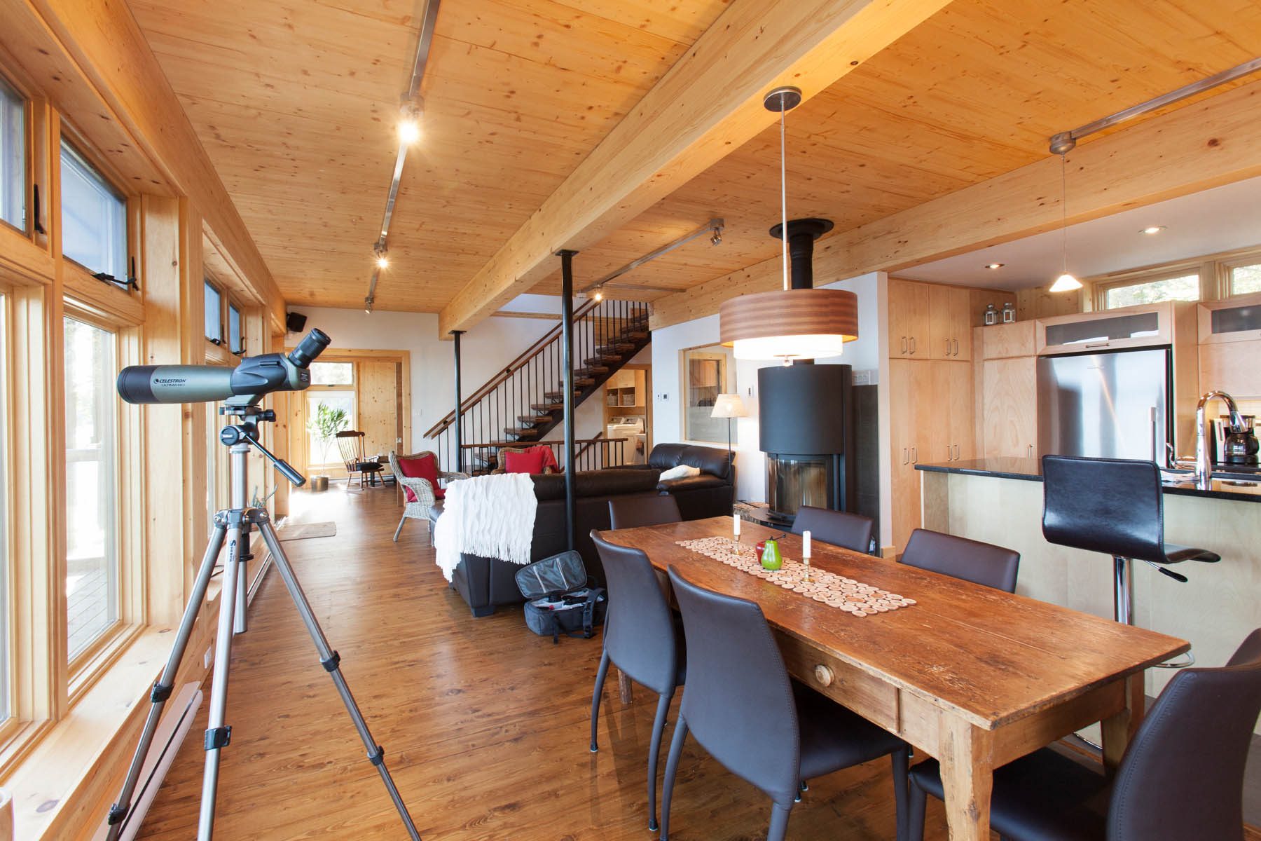 TERGOS a réalisé la conception et la construction de ce projet situé au bord du Lac Etchemin. La volumétrie simple, déposée littéralement sur le roc, profite d’une implantation parallèle au lac et ouverte sur le sud. La grande façade vitrée, protégée par des débords de toits, permet un excellent apport solaire passif en hiver tout en évitant les surchauffes estivales. La résidence écologique profite aussi d’une toiture végétale, qui absorbe la chaleur et protège la membrane étanche de la toiture en prolongeant sa durée de vie. L’enveloppe valorise l’utilisation des matériaux sains, verts, naturels et durables, tout en permettant une performance énergétique supérieure.