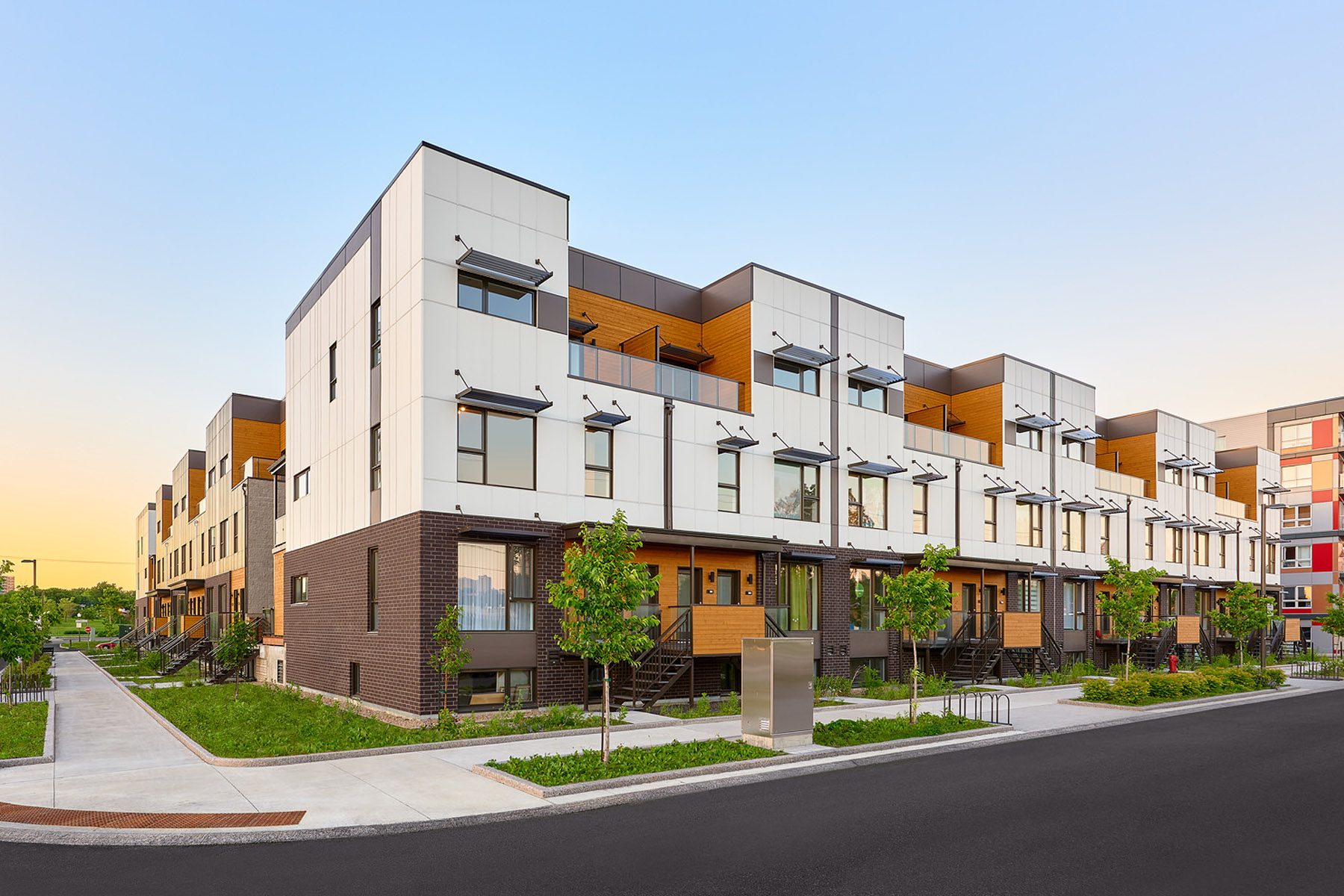 Situées dans l’écoquartier de la Pointe-aux-Lièvres, les Écopropriétés Habitus s’implantent sur une ancienne friche industrielle et la transforment en un milieu de vie durable, esthétique et verdoyant. Les 52 unités d’habitation traversantes et sur 2 étages sont réparties en 4 bâtiments orientés autour d’une cour intérieure verte et partagée. Une promenade en surplomb fait le tour de cette cour et donne accès aux habitations. C’est sous cette promenade que l’on retrouve les stationnements extérieurs couverts, qui sont donc complètement dissimulés pour laisser la place aux aménagements paysagers.