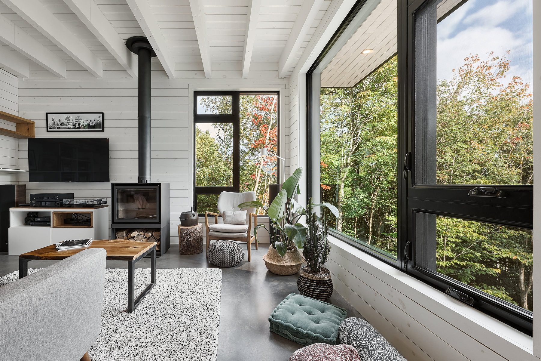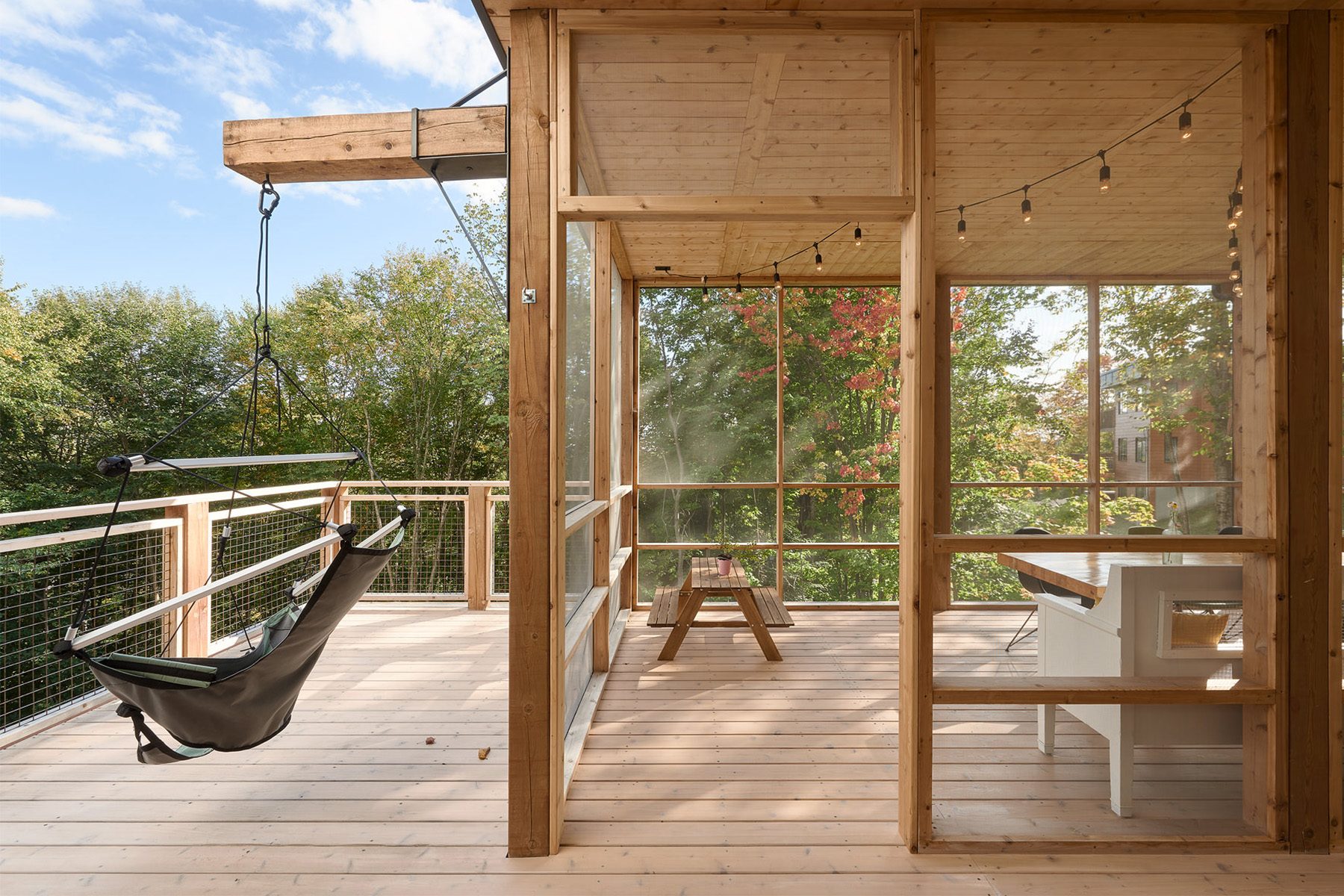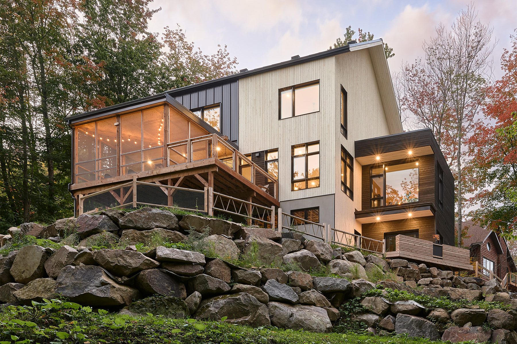 Cette résidence se trouvant à Stoneham met à profit le dénivelé du terrain existant pour générer une expérience architecturale agréable au quotidien. L’implantation en flanc de montagne permet de profiter d’un rez-de-jardin ainsi que d’une grande terrasse en hauteur qui s’intègre harmonieusement à son milieu. La terrasse devient l’élément central autour duquel les espaces prennent vie. La générosité et la flexibilité des espaces extérieurs en font des lieux habitables pendant la quasi-totalité des quatre saisons.
